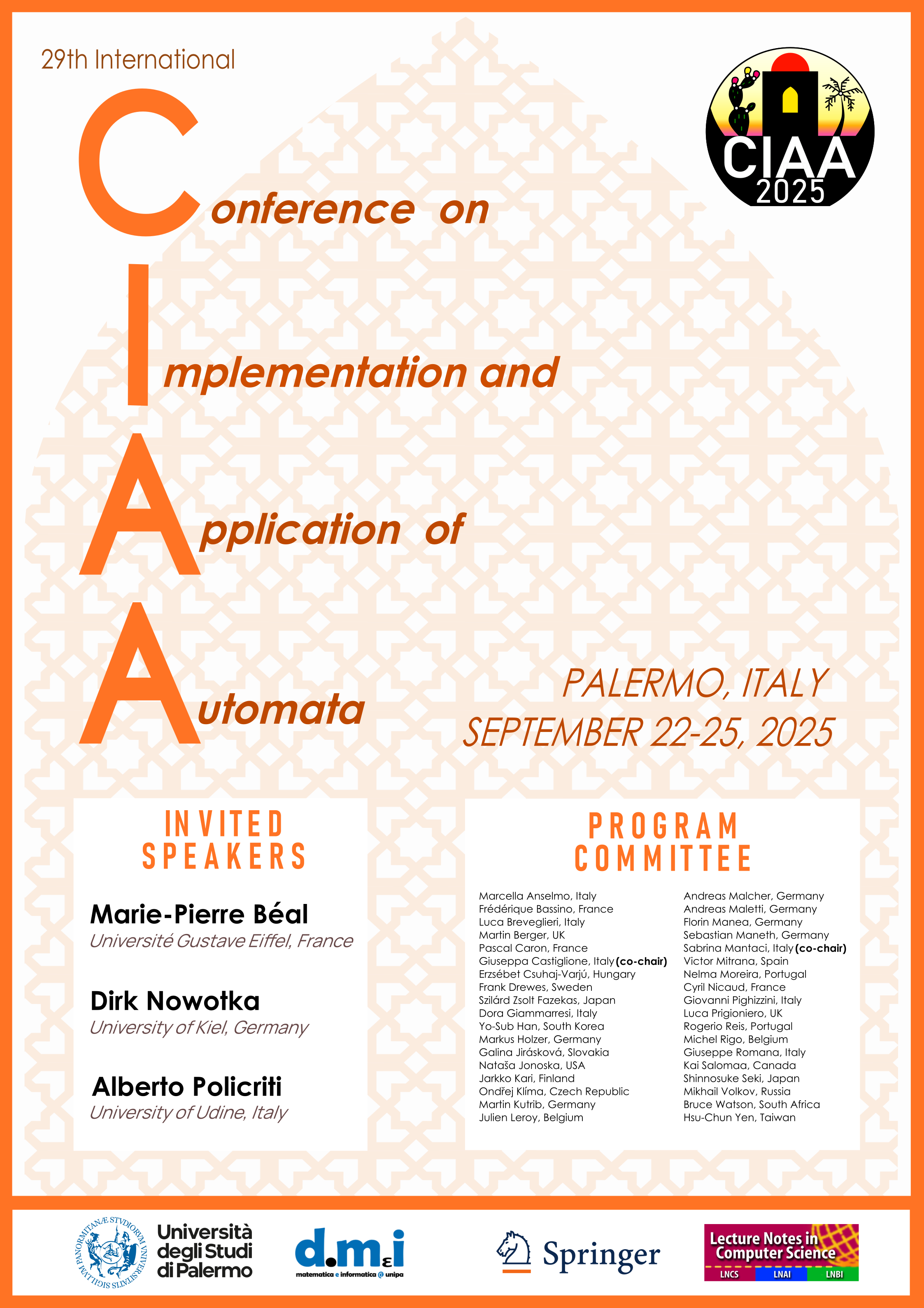 The International Conference on Implementation and Application of Automata (CIAA) is an annual conference that aims to bring together members of the academic, research, and industrial community who have an interest in the theory, implementation, and application of automata and related structures. The conference concerns research on all aspects of implementation and application of automata and related structures, including theoretical aspects.